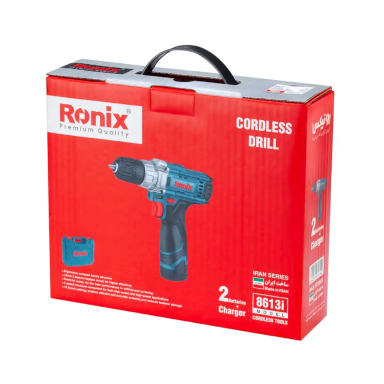 دریل پیچگوشتی شارژی 12 ولت رونیکس مدل 8613i، ساخت ایران است. این ابزار شارژی، ترکیبی از دو ابزار دریل و پیچگوشتی بوده و دارای یک سه نظام اتوماتیک دو پوسته 10 میلیمتری است که موجب عملکرد بهتر این دریل پیچگوشتی شارژی میشود.