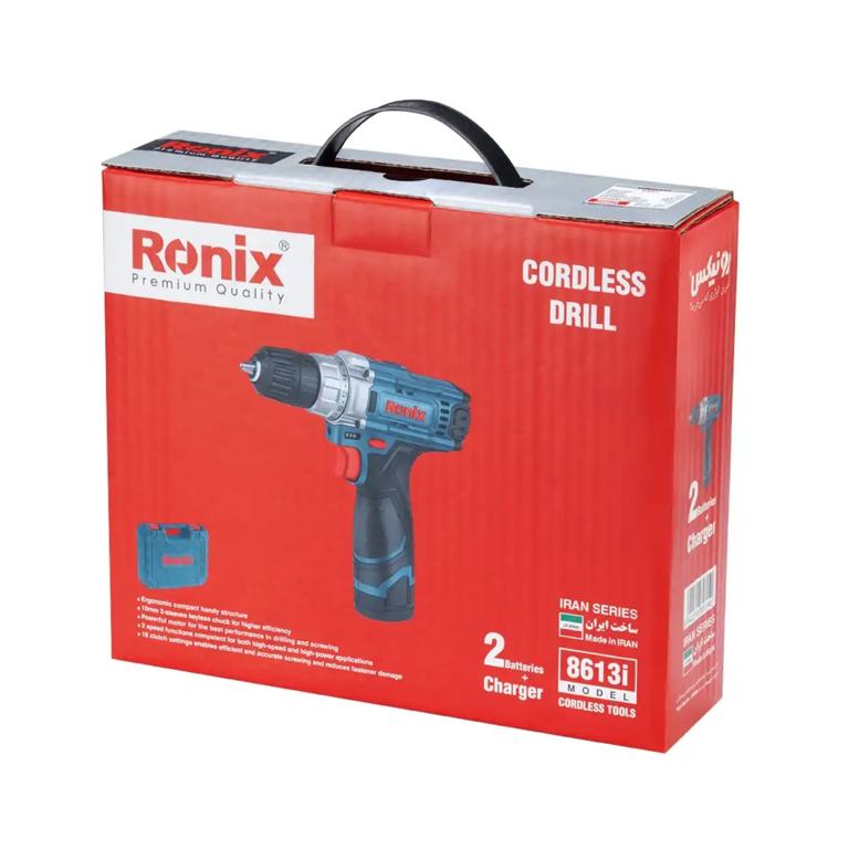 دریل پیچگوشتی شارژی 12 ولت رونیکس مدل 8613i، ساخت ایران است. این ابزار شارژی، ترکیبی از دو ابزار دریل و پیچگوشتی بوده و دارای یک سه نظام اتوماتیک دو پوسته 10 میلیمتری است که موجب عملکرد بهتر این دریل پیچگوشتی شارژی میشود.