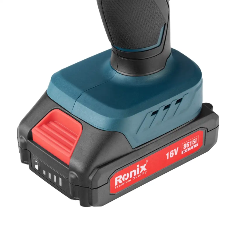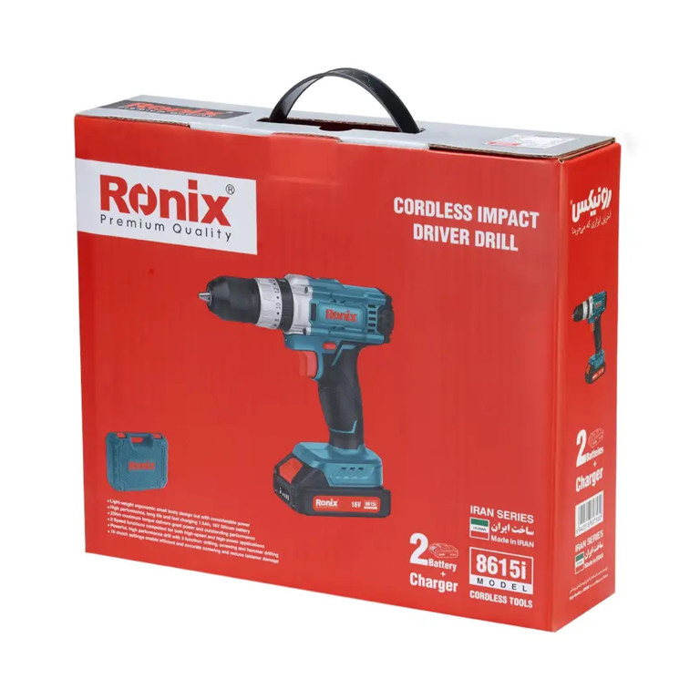 دریل پیچگوشتی شارژی 16 ولت 8615i رونیکس، ساخت ایران است. این محصول تاپ لاین، ابزاری قدرتمند با سه عملکرد مجزای سوراخکاری، پیچکاری و سوراخکاری چکشی است. دریل پیچگوشتی شارژی 8615i از یک سهنظام اتوماتیک و قدرتمند 10 میلیمتری و تمامفلزی بهره میبرد که نسبت به فشار حاصل از فعالیت در سطوح متراکم مقاومت خوبی از خود نشان میدهد. همچنین، این دستگاه شارژی، عملکرد مناسبی حین سوراخکاری سطوح بتنی، فلزی و چوبی دارد.